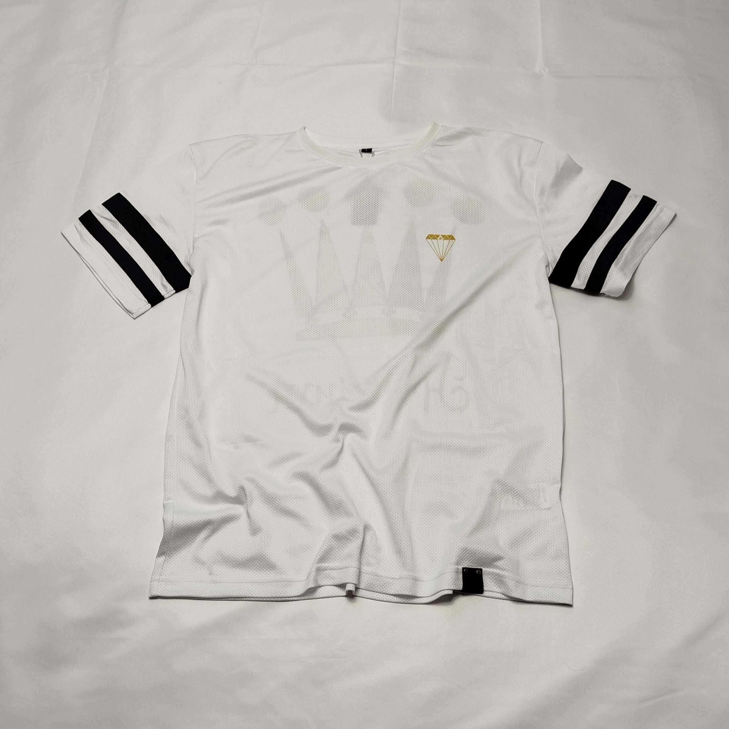 Dieses weiße Mesh-Shirt mit schwarzen Doppelstreifen an den Ärmeln kombiniert sportliche Ästhetik mit königlichem Flair. Auf der Rückseite thront eine goldene Krone mit fünf runden Akzenten – darunter der stilisierte „Hulegum“-Schriftzug in Gold. Die Vorderseite zeigt ein dezentes Krönungsmotiv mit Diamant-Detail. Das atmungsaktive Material macht es ideal für warme Tage, Sessions oder als Layer-Piece mit Haltung.
