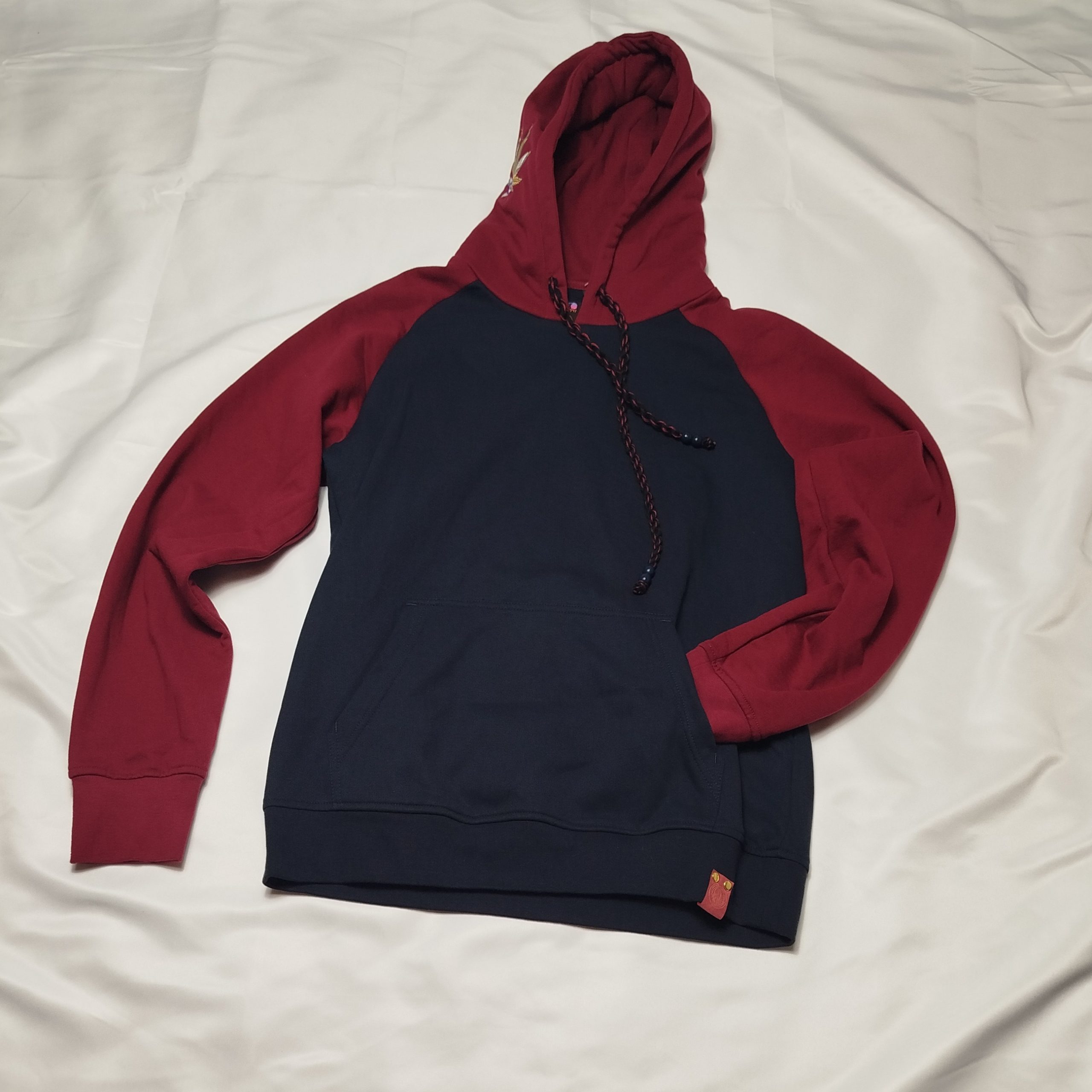 • Frontdetails: Praktische Kängurutasche, gedrehte Kordel in Schwarz-Rot und ein subtiler roter Label-Tag – kleine Details, große Wirkung.