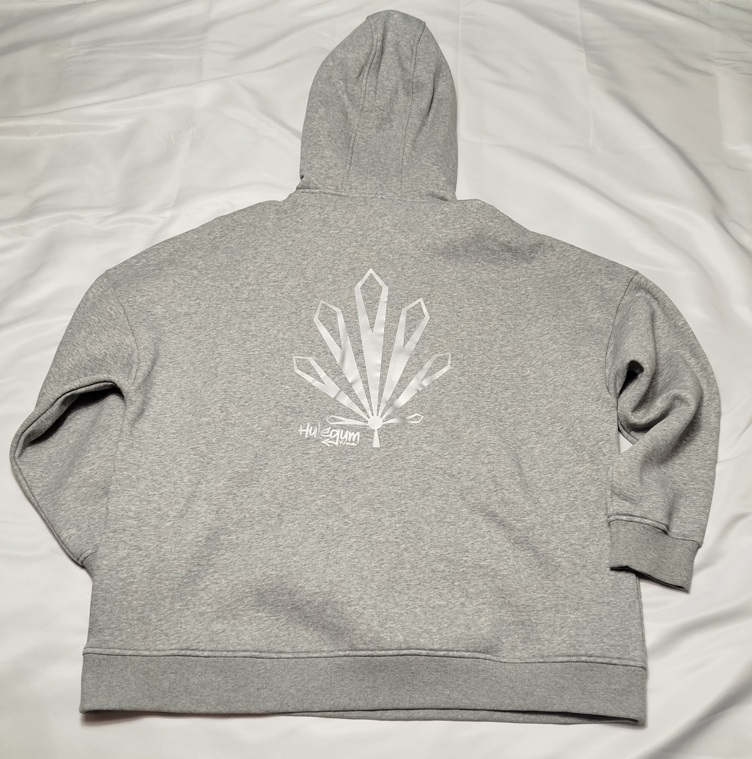 • Rückseite: Silberner Grafikprint mit kristallartigen Formen und dem Schriftzug „Hulegum“ – stylisch und markant