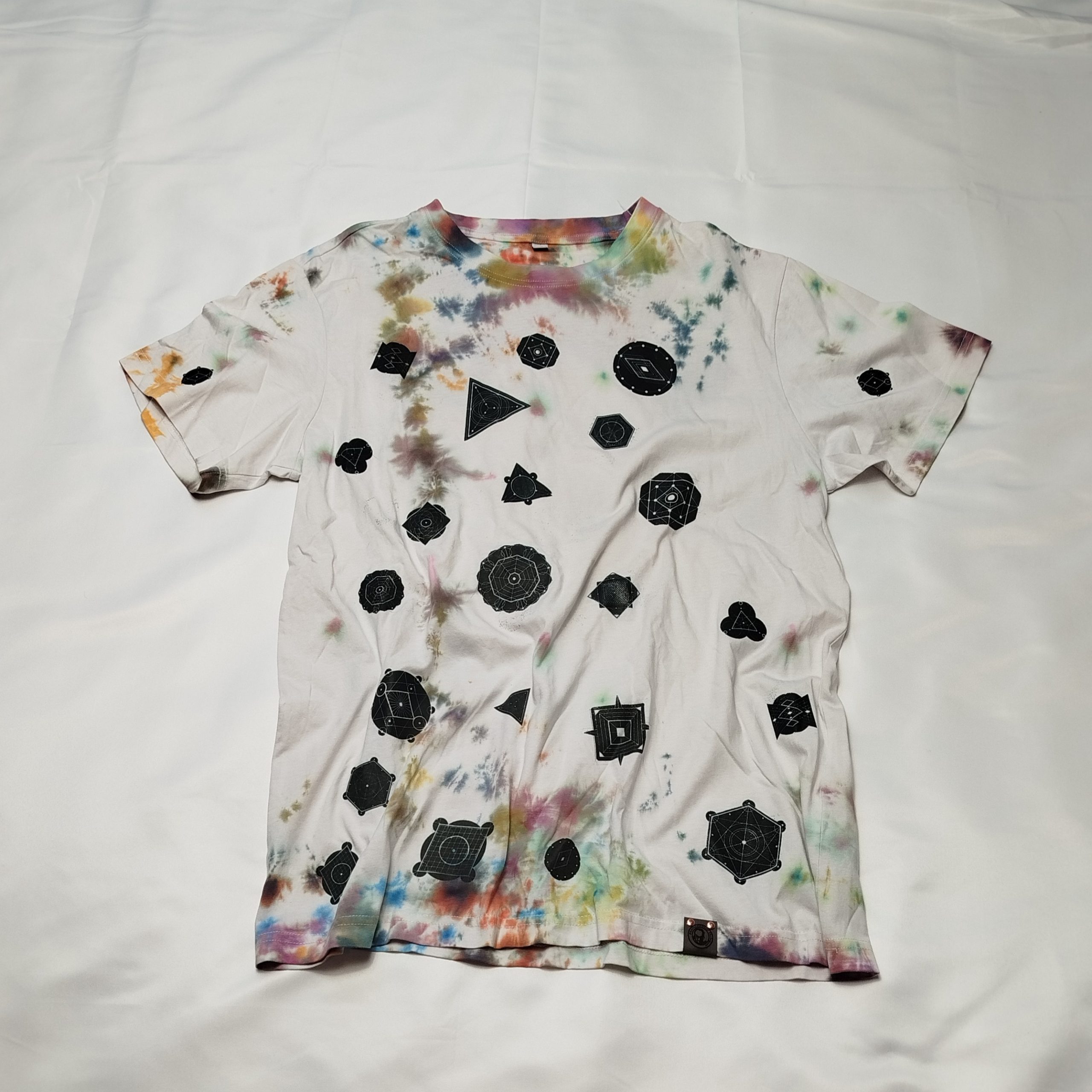 Dieses Shirt verbindet wissenschaftliche Ästhetik mit künstlerischer Freiheit. Über das lebendige Tie-Dye in Violett, Grün, Gelb und Blau legen sich schwarze geometrische Formen – von Polygonen über Kreise bis zu komplexen Symmetriefiguren. Das Ergebnis: ein visuelles Spiel zwischen Chaos und Ordnung, perfekt für alle, die Kunst und Intellekt auf der Haut tragen wollen.