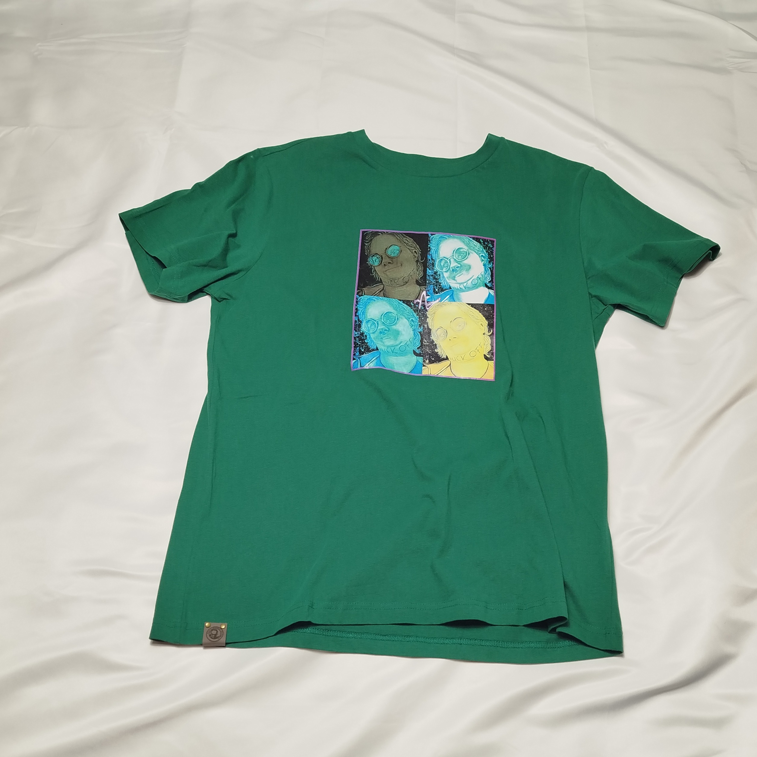 • Frontprint: Vier stilisierte Porträts im Pop-Art-Stil, jedes mit Doppelkinn und Attitüde
