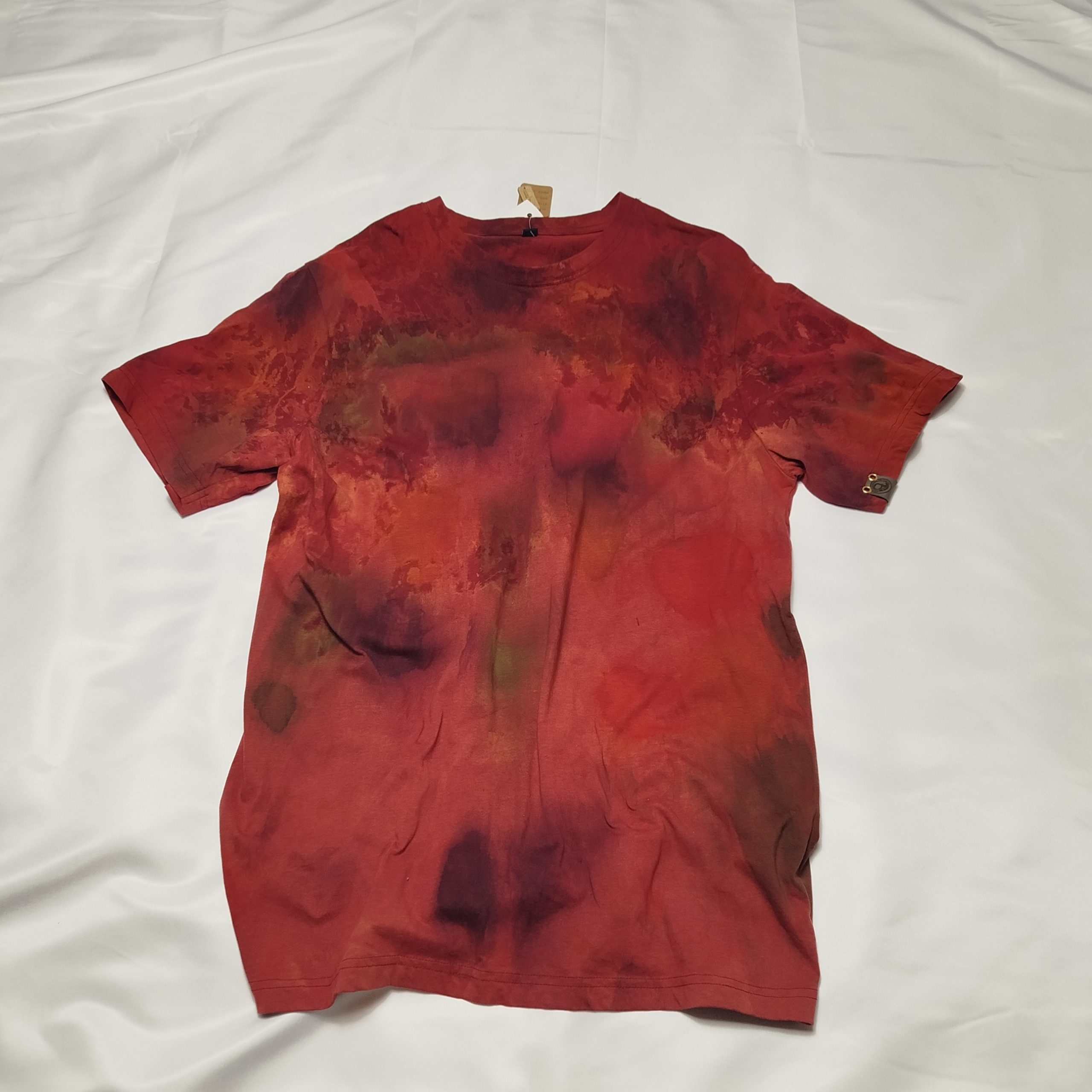 • Farbe: Rote Basis mit abstraktem Tie-Dye-Mix aus Schwarz, Grün und dunklem Rot