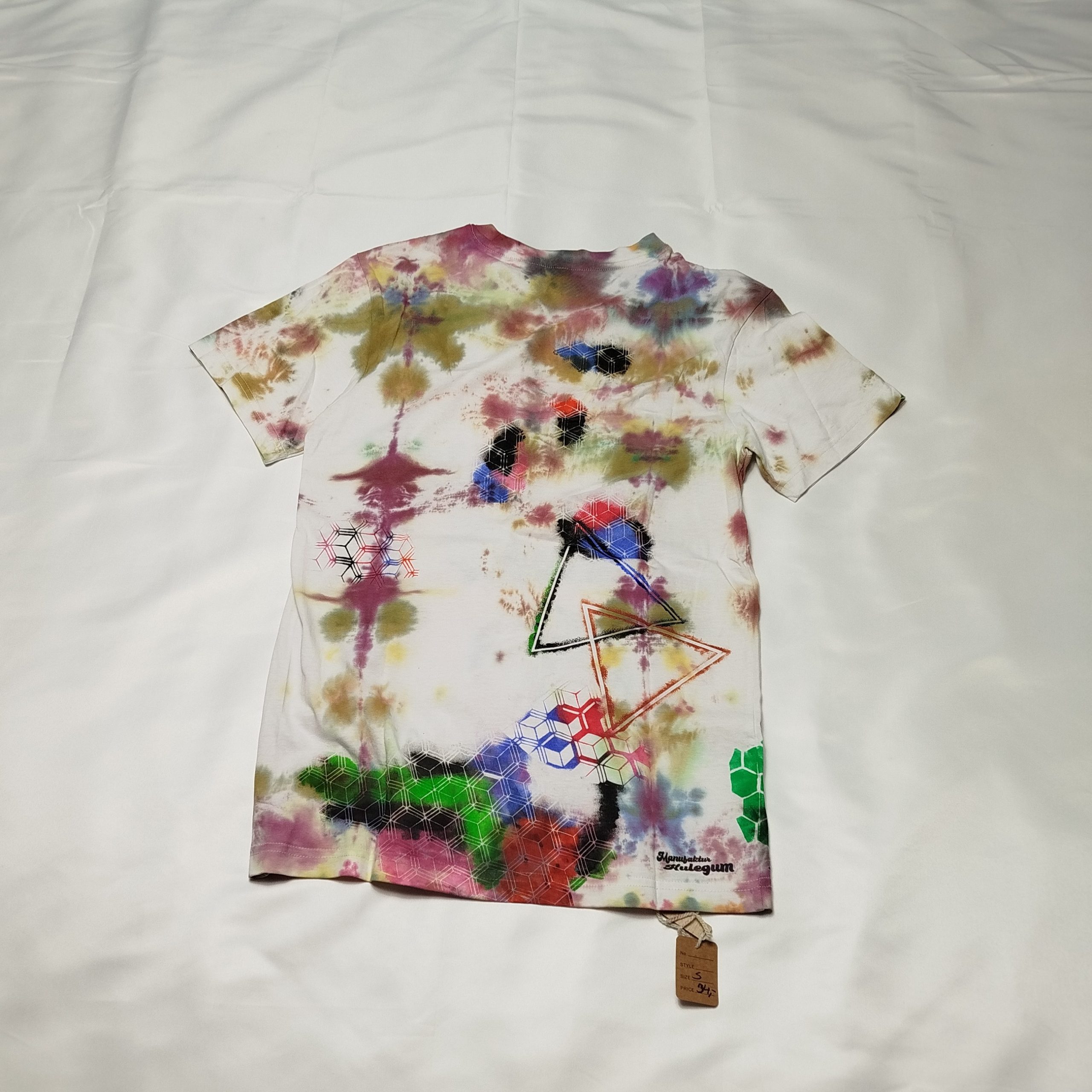 Dieses Shirt ist ein visuelles Manifest: Buntes Tie-Dye in Pink, Blau, Gelb und Grün trifft auf ein komplexes Muster aus Hexagonen, Kreisen und Dreiecken. Im Zentrum steht der multicolor „HULEGUM“-Schriftzug – ein klares Statement für kreative Identität und visuelle Vielfalt. Ideal für alle, die Kunst, Streetwear und Symbolik lieben.